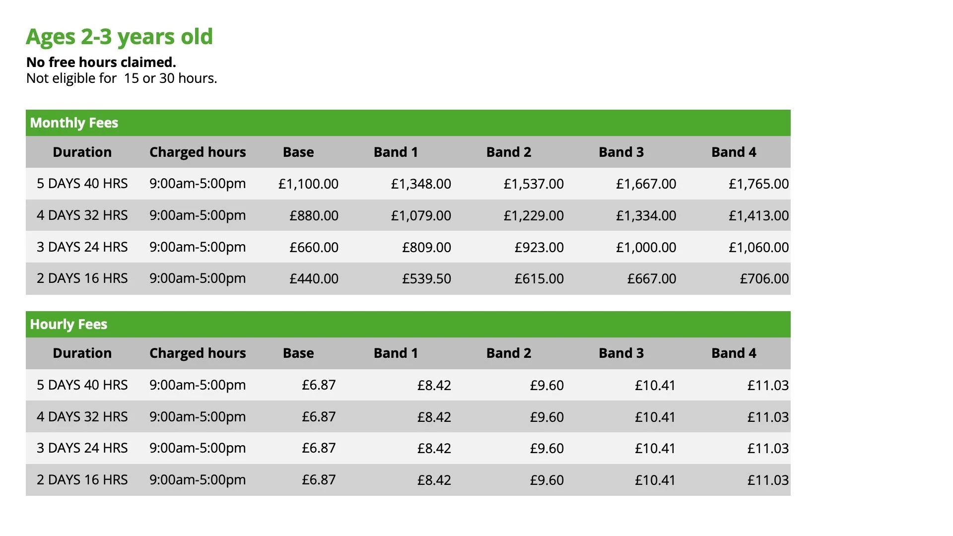 Fees are still payable if a child is absent from nursery through illness or holiday. There are no extra charges for food, activities or outings. Parents to provide nappies and formula if needed.
